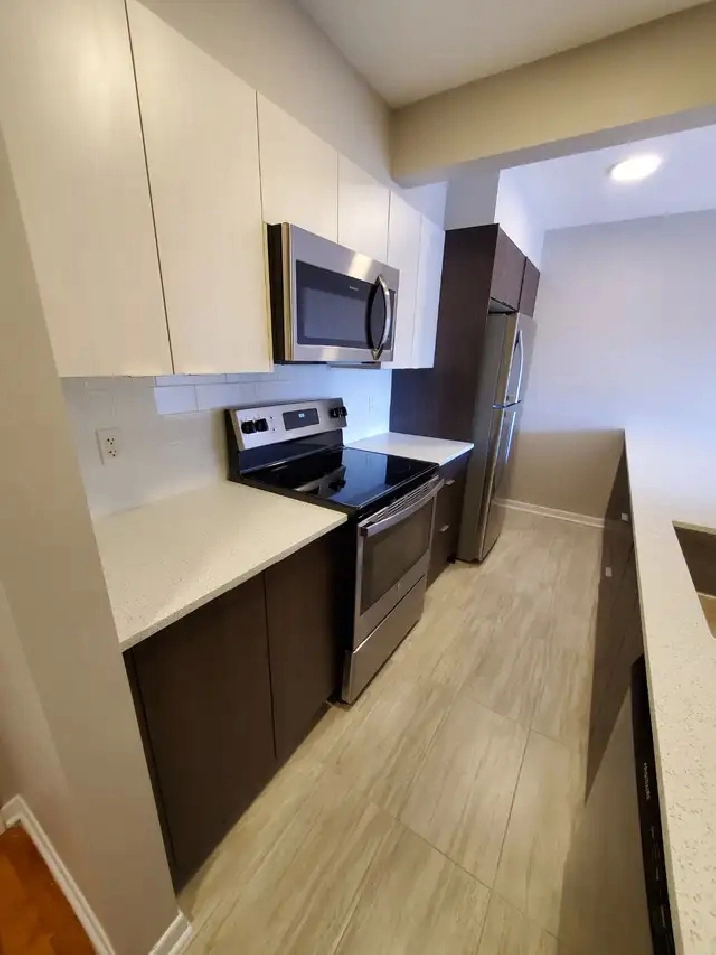 kitchen includes fridge, stove, microwave range hood.