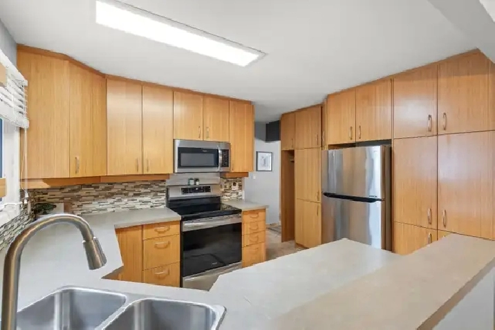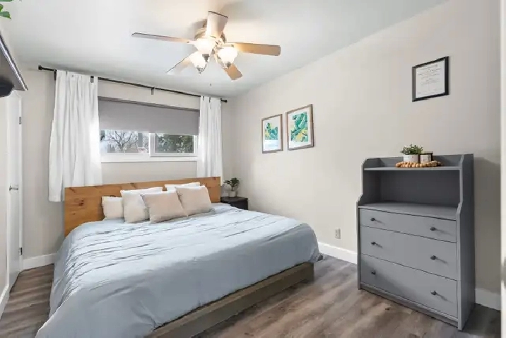 OTP April 1st. Extensively renovated & updated 1126 sqft 4 bdrm office, 2 full bathroom bungalow w/3 season sunroom & dbl detached garage. Step inside to LVP flring('20) throughout the main living area w/ pot lighting in the living rm & south facing pvc bay window letting in an abundance of natural light. Formal dining room is open to the remodelled kitchen('14) offering plenty of counter & cabinet space, heated tile flooring, tile backsplash, pantry, garburator & all appliances included.3 spacious main flr bdrms w/ample closet space, remodelled 4 pc bthrm('14) w/custom tile tub surround, tile flring & large vanity. Full basement finished in 2025 w/ all required building permits pulled.Huge rec rm w/ wet bar, drop ceiling, pot lighting & wired for surround sound. 4th bdrm w/ proper egress window, office w/ tons of space for filing, 3 pc bthrm w/ tile flring & acrylic walk in shower. Addtl features & upgrades:Dual stage hi eff furnace('21) Shingles('16), entire basement walls have been spray foamed, sump pump('24) sub panel('25) pvc windows throughout, central ac, Aluminium soffit & fascia, fenced backyard, walking distance to schools, parks, amenities & public trans.