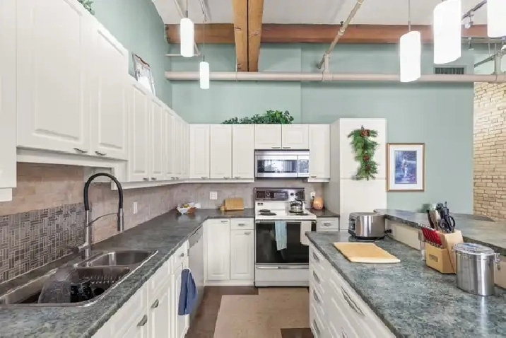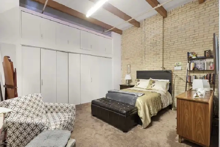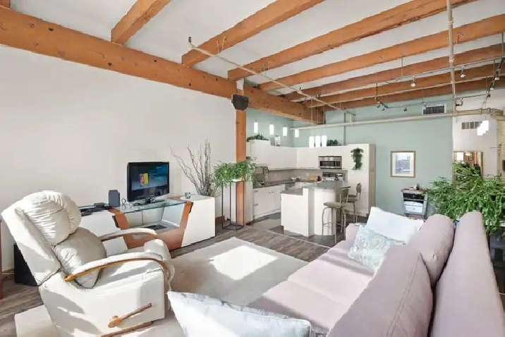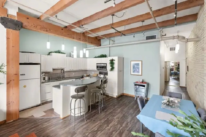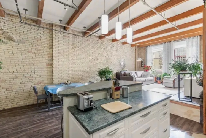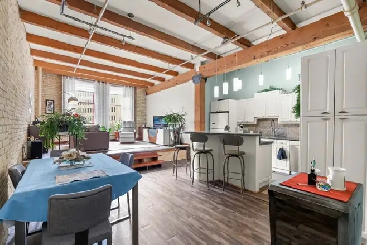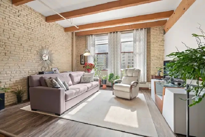 Offers as received! Welcome to The Ashdown Warehouse, one of Winnipeg’s most sought-after loft buildings! This iconic building welcomes you with a stunning foyer, spacious hallways, massive fir beams, and beautiful reclaimed brick that showcase its historic charm. Step inside this spacious condo featuring a large entryway that leads into the open concept living room, dining area, and kitchen. The south-facing living space is filled with natural light and highlights the building’s character with exposed beams and reclaimed brick walls. The large white kitchen is both stylish and functional, complete with a generous island perfect for cooking and entertaining. Down the hall you’ll find a spacious bedroom that comfortably accommodates a king-size bedroom suite and offers ample closet space. The updated bathroom is well appointed, spacious, and highly functional. Additional features include a secure parking spot in the small parkade next door. Experience the charm of loft living in the heart of the Exchange District. Book your showing today!