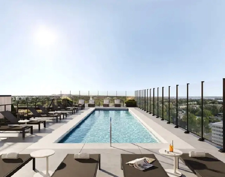 Terrasse au 9e étage magnifiquement aménagée avec piscine, lounge extérieur, coin détente et vue imprenable