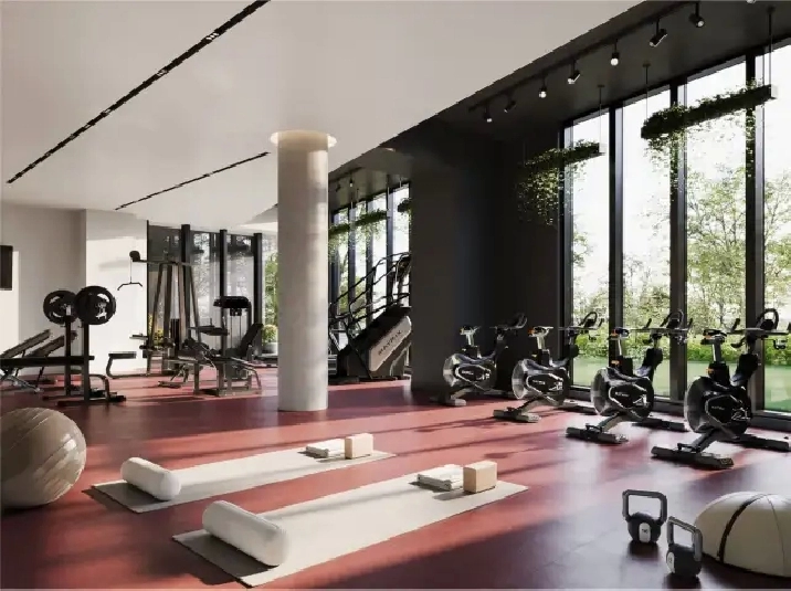 Gym vaste et vitré, incluant beaucoup déquipement dentraînement et une salle privée avec téléviseur pour un entraînement personnel