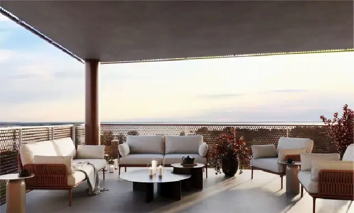 Lounge au 7e étage avec cuisine communautaire, terrasse avec barbecue, jardins communautaires, et vue sur le fleuve, idéal pour lapéro devant le coucher de soleil
