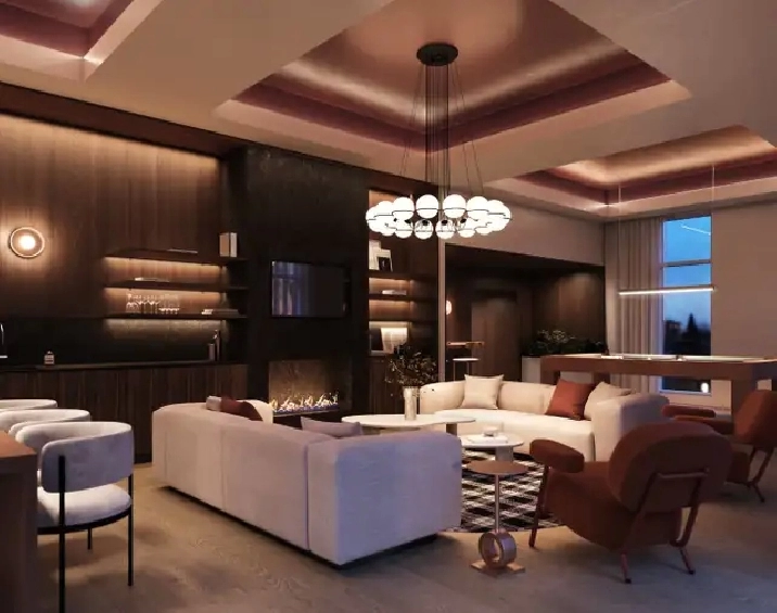 Chalet urbain avec lounge, foyer, bar, table de billard, banquette et téléviseur.