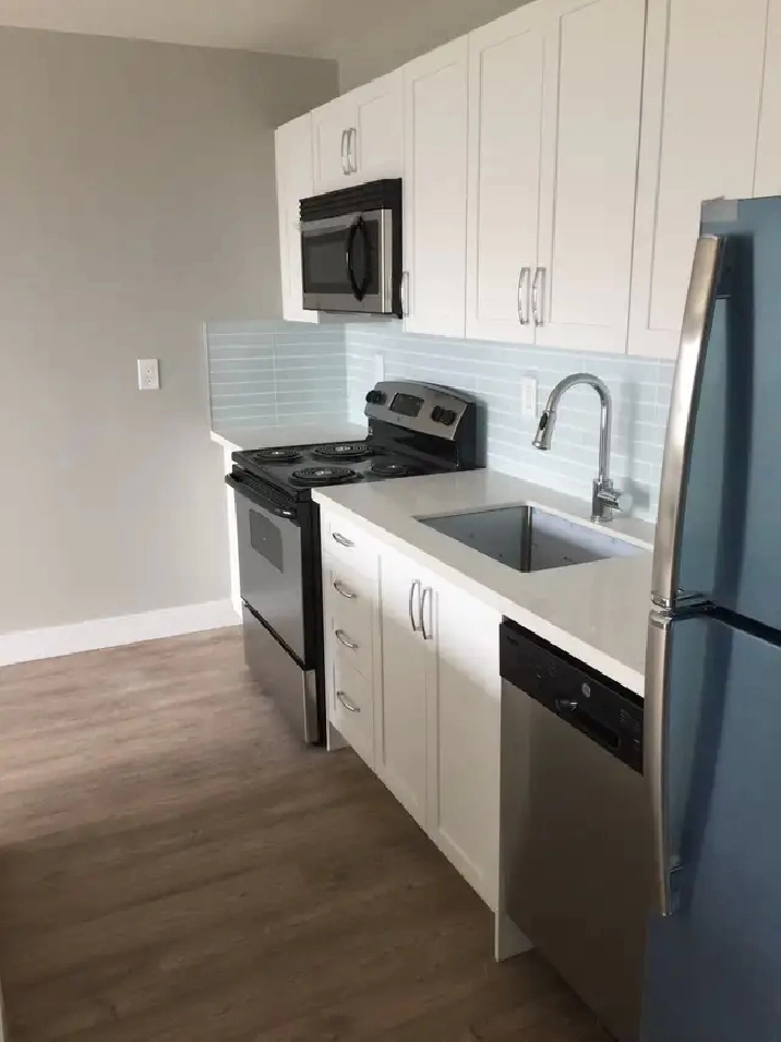 Brand New 1 bedroom modern living, featuring bright, open-concept suite with wide plank flooring, stainless steel appliances (stove, fridge, dishwasher and microwave). New bathroom and kitchen with a large amount of storage with quartz counter-tops and island breakfast area.