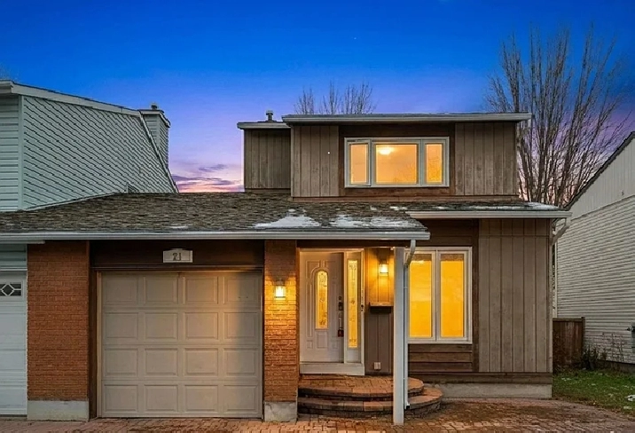 Fantastic semi-detached family home attached only by the garage, offering comfort, privacy, and an unbeatable location. Enjoy no rear neighbours, a fully fenced backyard, and beautiful interlock landscaping in both the front and back. Step inside to find new hardwood floors throughout the main and second levels, an updated full bath and powder room, and all PVC windows for improved efficiency. The bright eat-in kitchen is perfect for everyday meals, while the dining room opens seamlessly to a warm and inviting living room featuring a wood-burning fireplace and large windows overlooking the private yard. The fully finished basement adds valuable living space, complete with a 2-piece bathroom, a versatile den, and abundant storage options. Located on a quiet, family-friendly street, this home is within walking distance to several schools, shopping, parks, the recreation complex, and public transit just steps away. A wonderful opportunity to own in a convenient and desirable neighbourhood. Some of the photos are virtually staged.