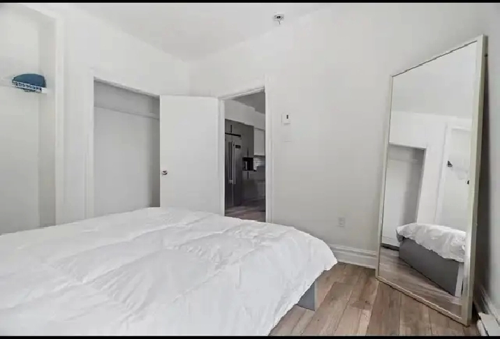 -Un lit queen avec draps, oreiller, couette, un meuble de rangement dans chaque chambre