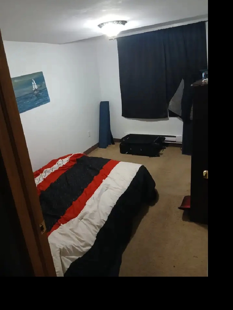 La chambre est fermée (clé individuelle) et un grand lit est fourni. La colocation se fera avec 1 autre personne. Vous aurez accès à votre propre frigidaire et partagerez une salle de bain et une petite cuisine avec 1 colocataire.
