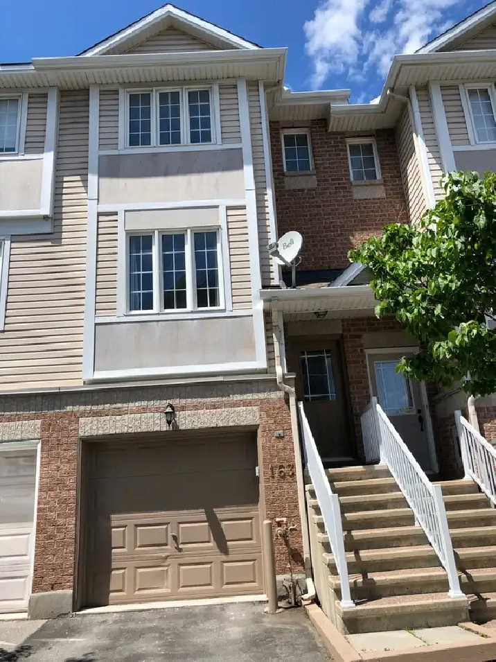 Three-story Townhouse with good sized 2 bedrooms plus den, 1.5 bathrooms located in a quiet friendly neighborhood in central park! First floor with den behind garage, could use as a bedroom or office space. Second floor has bright Living/Dining room with hardwood floor. Kitchen with new Vinyl floor. Nice deck pass through patio door from breakfast area. Third floor has a spacious master bedroom with walk-in closet. Good sized second bedroom with large sliding closet. Four pieces bathroom with big romantic tub and walk in shower. New vinyl flooring in bedrooms, den and staircase. Include 5 appliances, Central A/C, Single car garage and opener. Available now. Close to shopping center, schools, just minutes away from bus stop and highway 417. A lot of walking and biking path close by the neighborhood. Credit check required. Tenants pay all utilities. At least one year lease. For viewing the house, please email at Jimmykuang123@yahoo.com or call me at 819-702-2278.