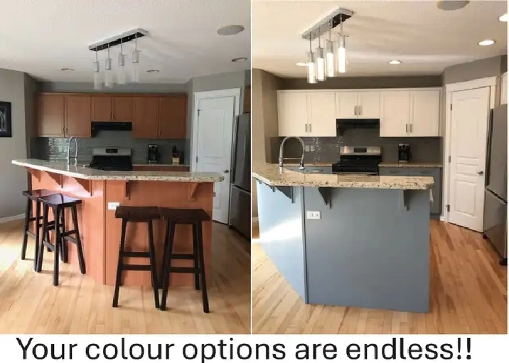 #Cabinet Refinishing-- professionally sprayed in our shop and completed in as little as a week. For a fraction of the cost of new cabinets and a full Reno we can update your Entire Kitchen. You Choose the colour and sheen and we can create the kitchen of your dreams!!